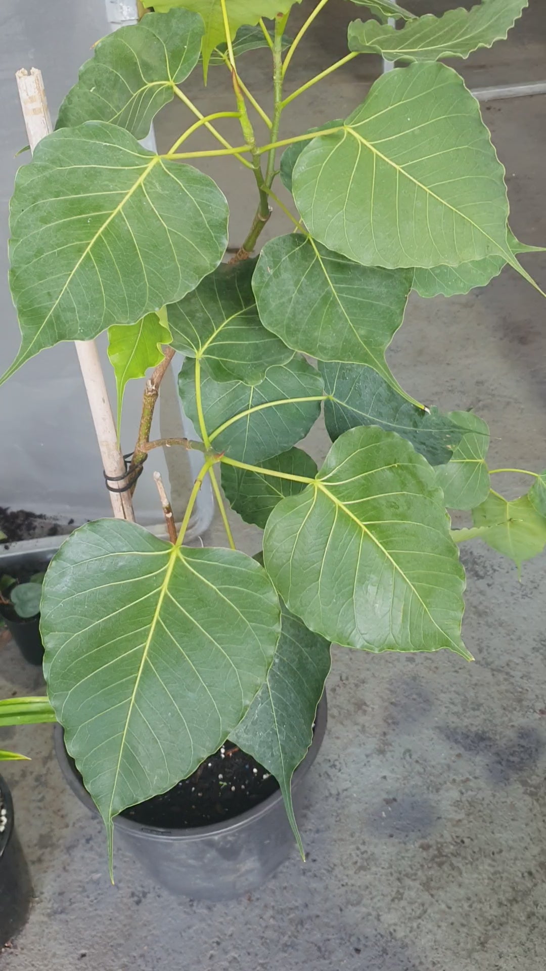 The Peepal tree, also known as the Sacred Fig or Ficus religiosa, is a boad deciduous tree native to the Indian subcontinent and Southeast Asia. It has a unique heart-shaped leaf with a long, pointed tip, which is mostly considered a symbol of spiritual growth. The tree is well-known for its sprawling canopy and aerial roots. Its bark is smooth and grey, and it produces small fig-like fruits, though these are mostly not as prominent as its leaves.